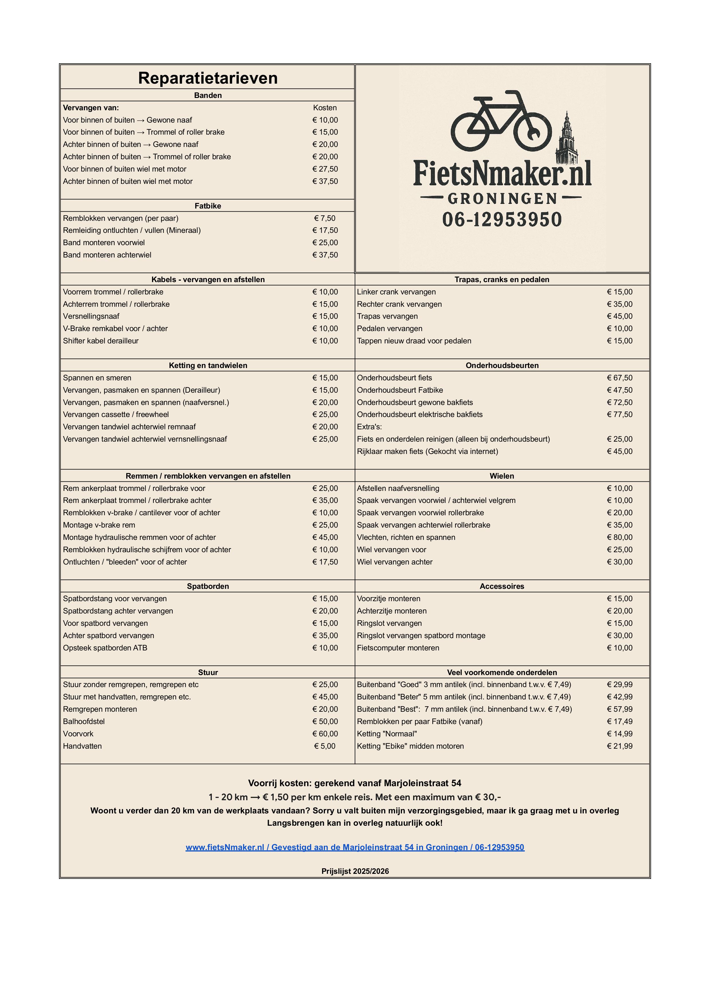 Hieronder vindt u de vele mogelijkheden voor onderhoud en reparatie van uw fiets. Onze prijslijst is gebaseerd op de Bovag werkplaats tijden. De prijslijst is ter indicatie en exclusief onderdelen. Heb je een ander probleem met je fiets? Neem dan vrijblijvend contact op.